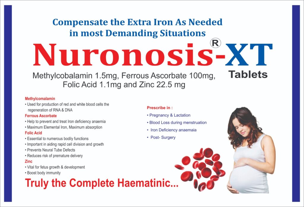 Nuronosis-XT Tablet is a dietary supplement with vitamins and minerals such as Ferrous Ascorbate(iron), Folic acid, Methylcobalamin, and Zinc.